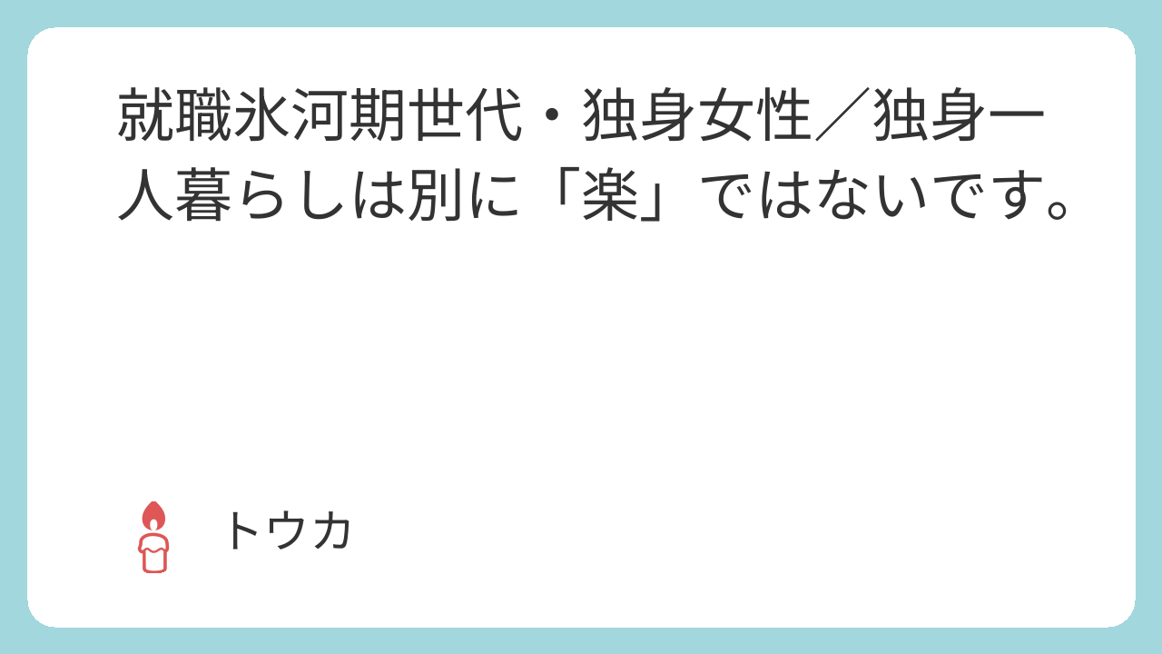 時々「実家住みの独身」と「独身の一人暮らし」を混同して羨ましがる人がいますが、その二つは全くの別物です。羨ましがるなら、ぜひそこをちゃんと区別してからにしてほしいな、と思っています。